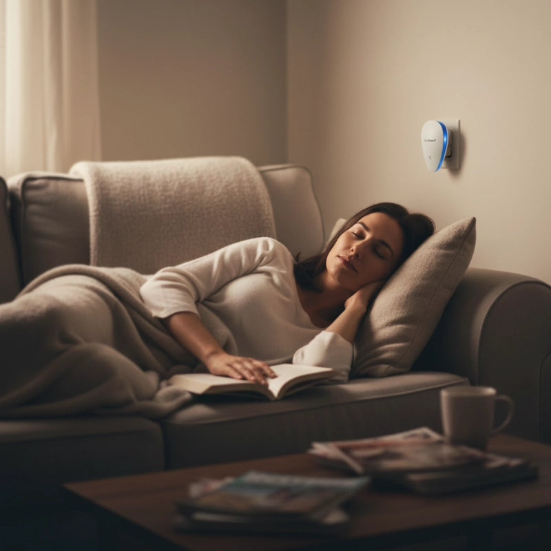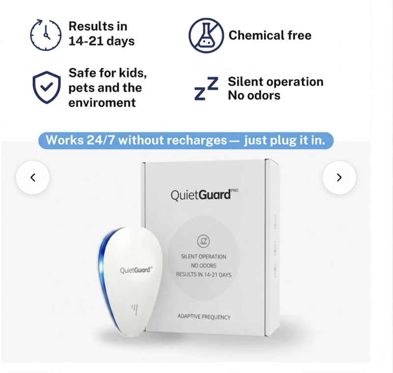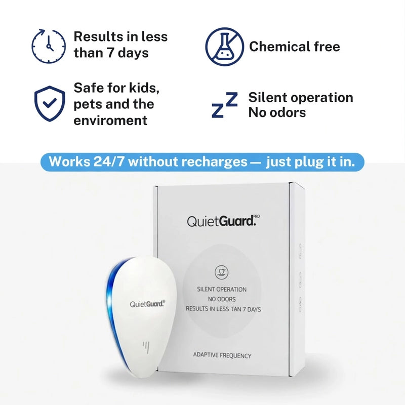 QuietGuard™ Pro uses adaptive frequency tech to effortlessly create a quiet, comfortable space. It's designed to be ultra-silent and chemical-free, giving you back your peace of mind.