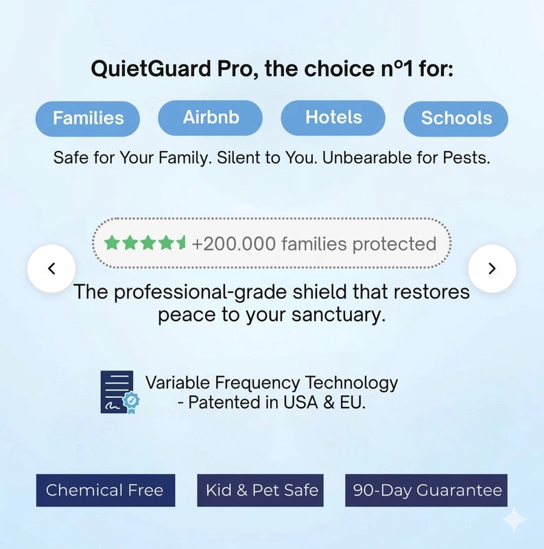 Stop worrying about harsh chemicals or loud devices. QuietGuard™ Pro is 100% chemical-free and ultra-silent, ensuring your little ones and furry friends are always safe and sound in a tranquil environment. Breathe easy, truly.